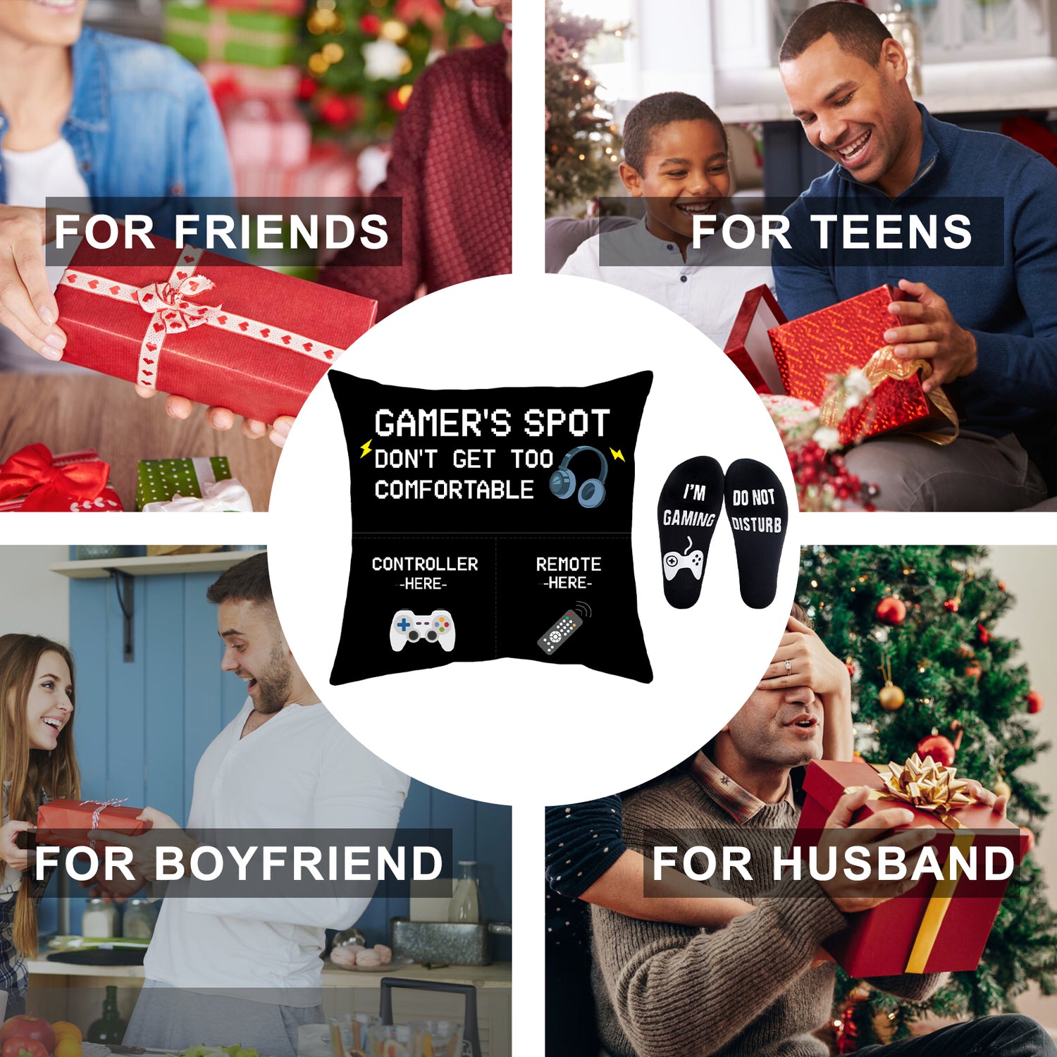 Gamer Gifts Pillow Cover Case 18x18 inch with Dual Pockets and Funny Gamer Socks, Gaming Room Decor Party Decorations, Teenage Gift Idea Christmas Stocking Stuffers for Teen Boys Men Him