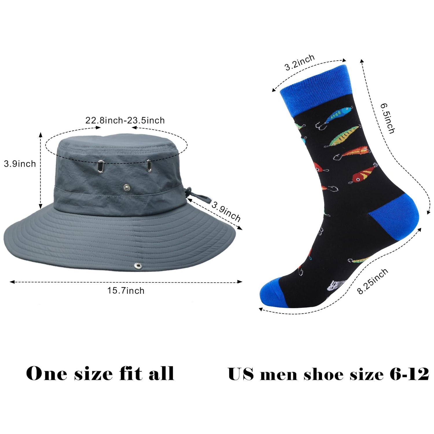 【Unique Fisherman Gifts】This gift set contains a fishing safari hat and a pair of funny fishing socks that makes outdoor fishing so much fun. We do recommend it as a present or a stocking stuffer for men, father, son, dad, husband, grandpa, brothers, boyfriends, etc.