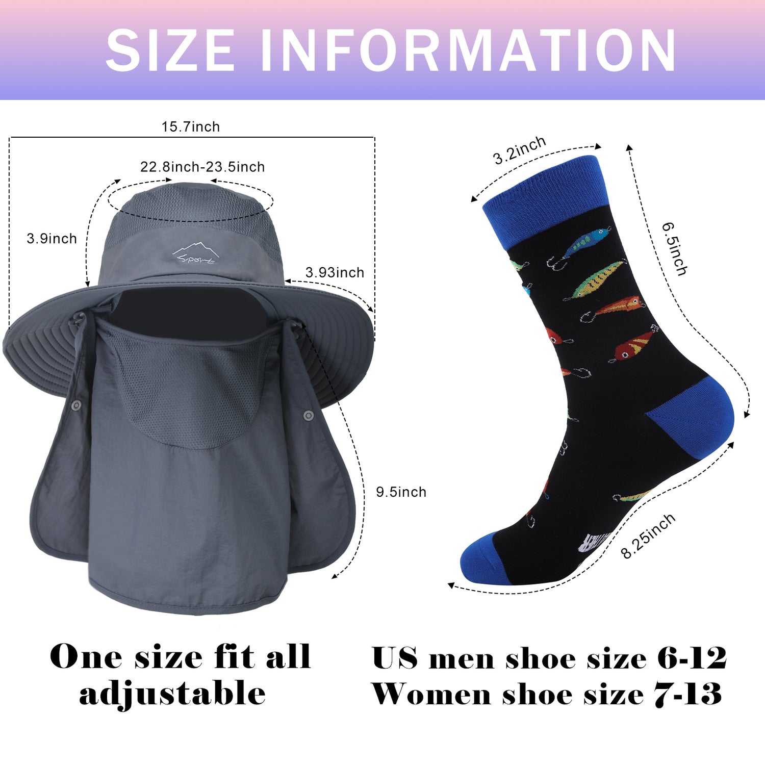 【Unique Fisherman Gifts】This gift set contains a fishing safari hat and a pair of funny fishing socks that makes outdoor fishing so much fun. We do recommend it as a present or a stocking stuffer for men, father, son, dad, husband, grandpa, brothers, boyfriends, etc.